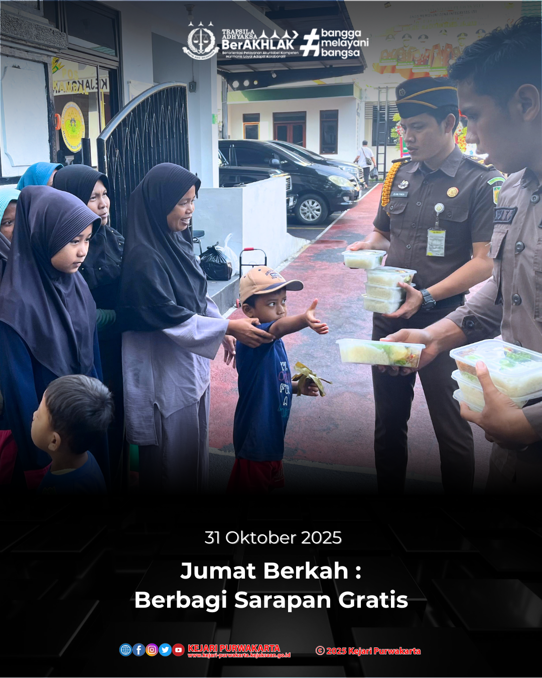 Dalam rangka menumbuhkan semangat kepedulian sosial dan mempererat hubungan antara aparat penegak hukum dengan masyarakat, Kejaksaan Negeri Purwakarta melaksanakan kegiatan “Jumat Berkah” berbagi sarapan kepada masyarakat sekitar lingkungan kantor, pada hari Jumat, 31 Oktober 2025.